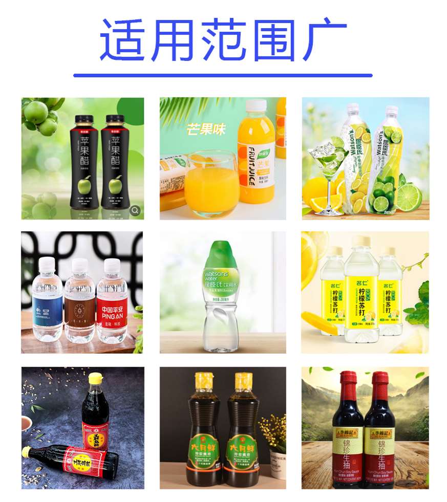 此生產(chǎn)線主要應(yīng)用于食品廠,酒廠,日化廠,化工廠,汽車用品等行業(yè)。例如:各種酒類,醋,醬油,飲料,水,剎車油,汽油添加劑等,設(shè)備采用先進(jìn)的光、電、氣一體化自動控制系統(tǒng),實(shí)現(xiàn)進(jìn)瓶,定位,灌裝,出瓶自動化生產(chǎn)。