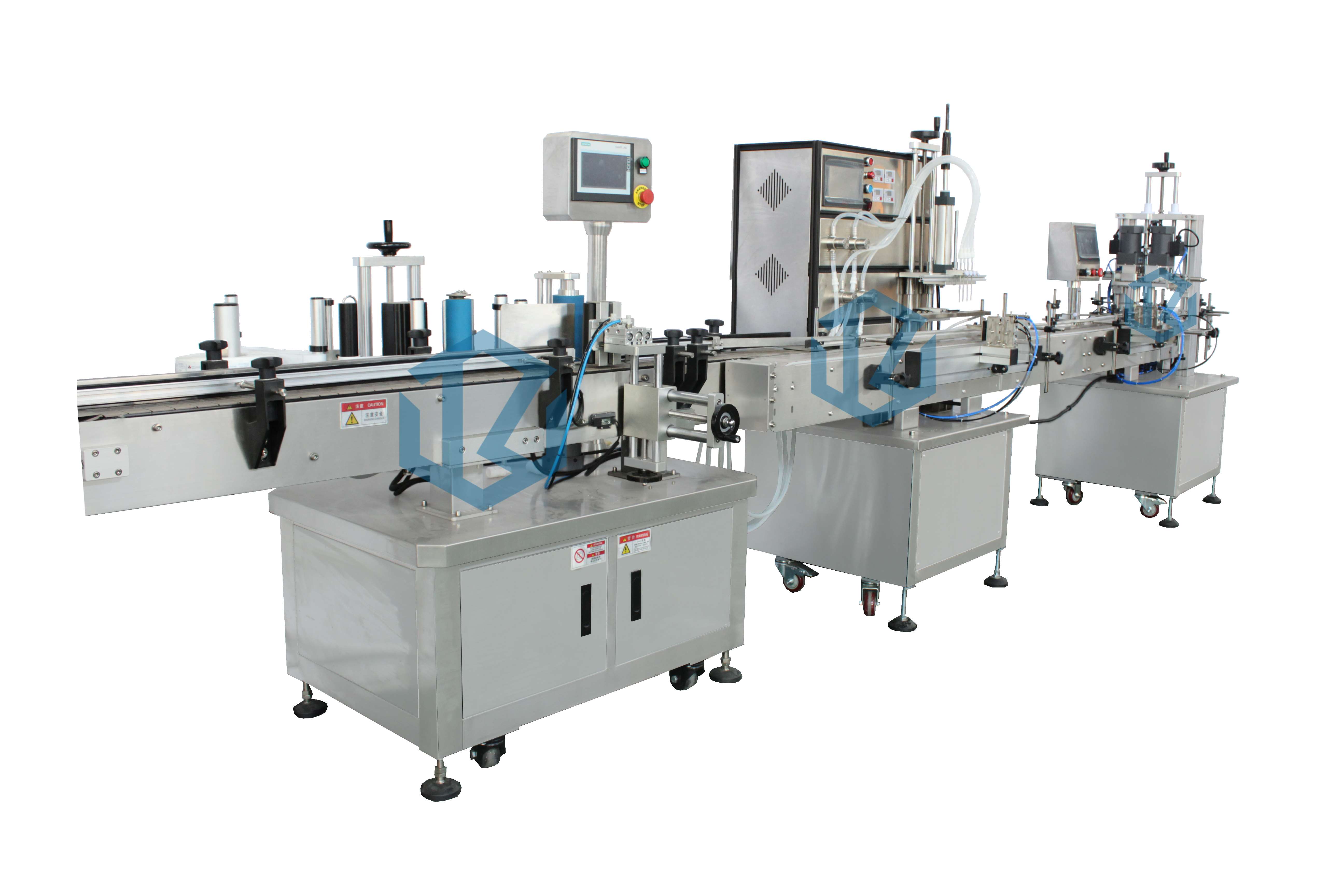 完成動作:人工放瓶-自動灌裝-機(jī)器放蓋-自動旋蓋–自動貼標(biāo)-人工收瓶